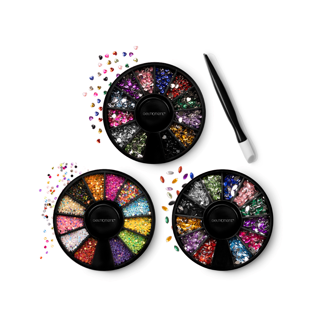 Mini Jewels are an ever-so-charming way to add a sparklingly lavish dimension to your manicure. Each set comes with 12 colours and an applicator stick, bundled together in a GelMoment organza sachet.