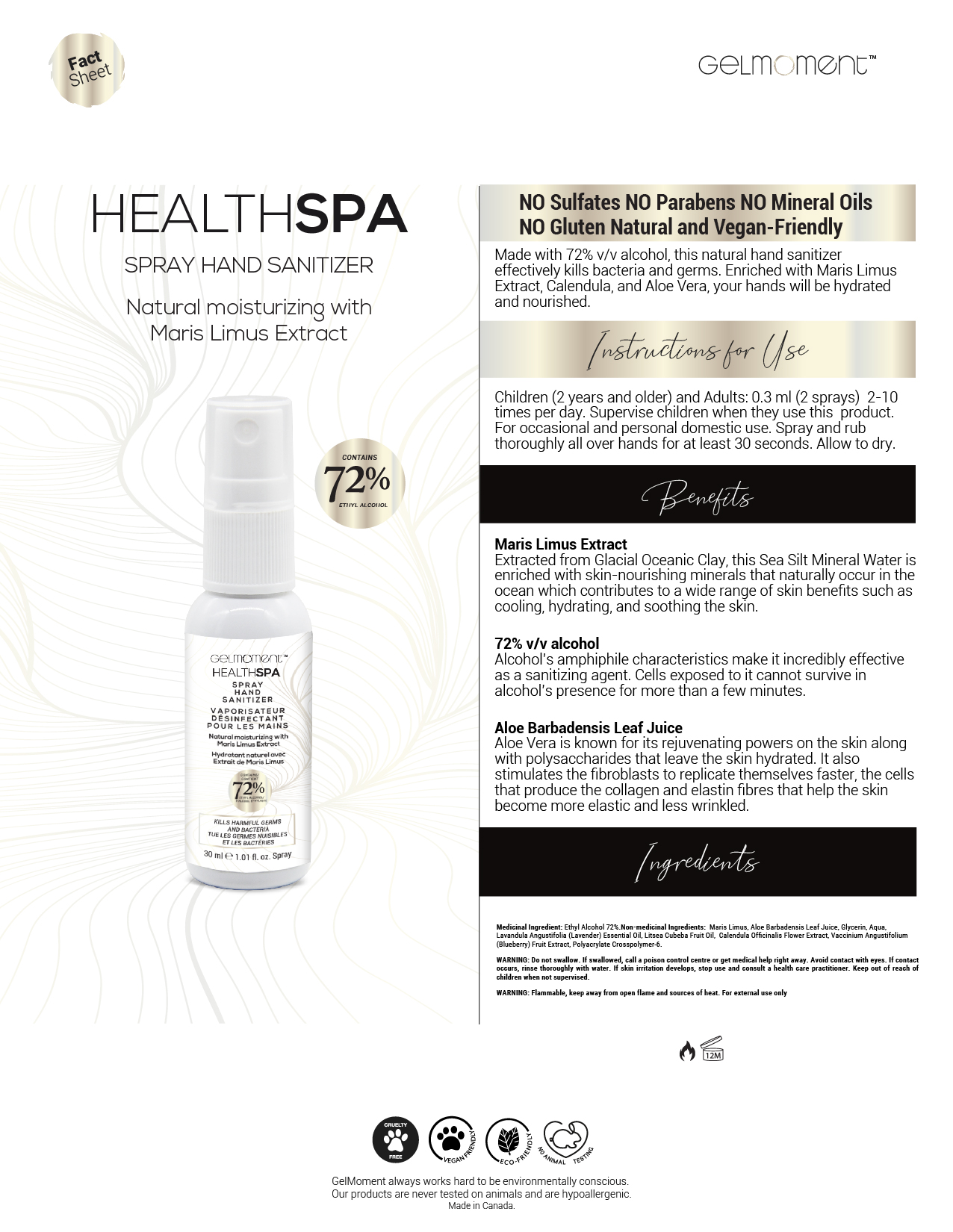 Made with 72% v/v alcohol, this natural hand sanitizer effectively kills bacteria and germs. Enriched with Maris Limus Extract, Calendula, and Aloe Vera, your hands will be hydrated and nourished.